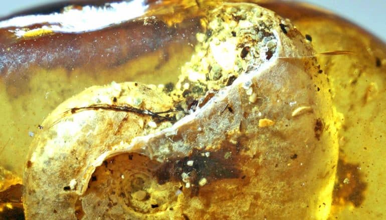 In addition to trapping the shell of an ammonite, the amber also contains the fossils of at least 40 other organisms from both land and sea habitats, such as spiders, snails, and wasps. This diversity of organisms preserved in one place may one day have the most potential for future research, Dilcher says.