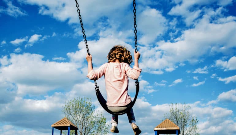 A young girl in pink swings at a park, with a cloudy blue sky in front of her and her back to the camera