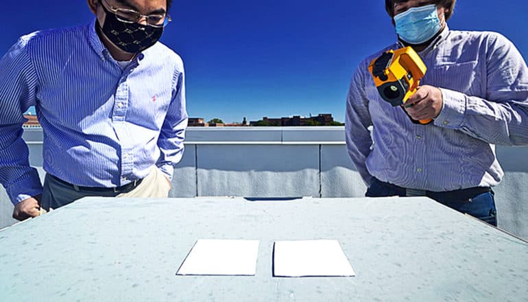 “An infrared camera gives you a temperature reading just like a thermometer would to judge if someone has a fever. These readings confirmed that our paint has a lower temperature than both its surroundings and the commercial counterpart,” Ruan says.