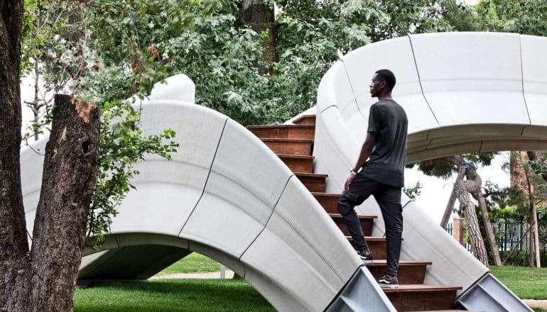 ETH Zurich architects and engineers from the Block Research Group in collaboration with Zaha Hadid Architects built a 12-by-16-meter (around 39.37-by-52.5 feet) arched footbridge in a park in Venice—entirely without reinforcement.