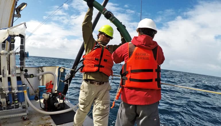 To make even one measurement, they need an enormous amount of water—a single sample includes about two thousand gallons of seawater. The researchers used a giant suction hose to collect the samples and employed a novel technique their team developed that involves extracting methane from each sample.