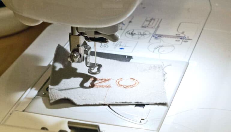 A sewing machine with embroidered letters stitched into a piece of fabric.