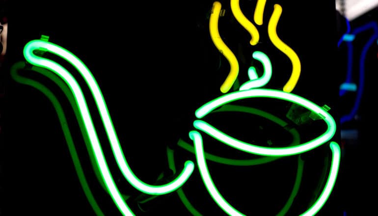 A neon sign in a store window shows a green pipe and yellow smoke coming out of it.
