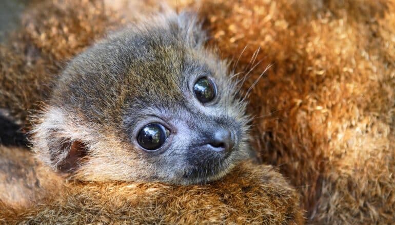 Red-bellied lemurs, one of only a handful of mammal species in which the males are active participants in caring for their young, are monogamous, tree-dwelling primates found throughout Madagascar’s eastern rainforests.