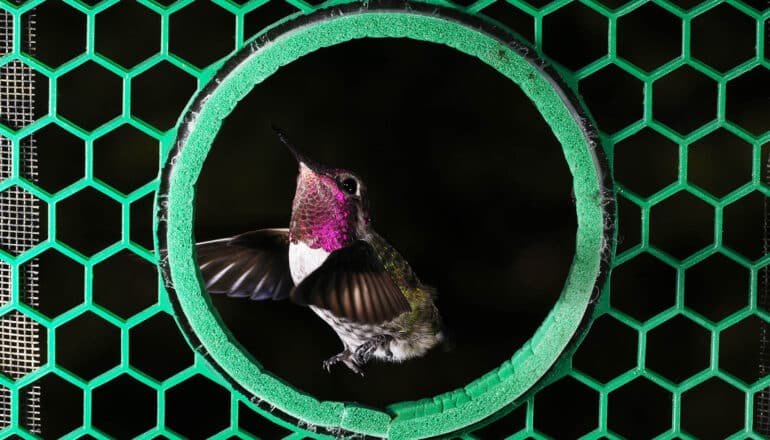 To discover how hummingbirds—in this case, four local Anna’s hummingbirds (Calypte anna)—slip through tiny openings, despite their inability to fold their wings, Badger and Dudley teamed up with UC Berkeley students Kathryn McClain, Ashley Smiley, and Jessica Ye.