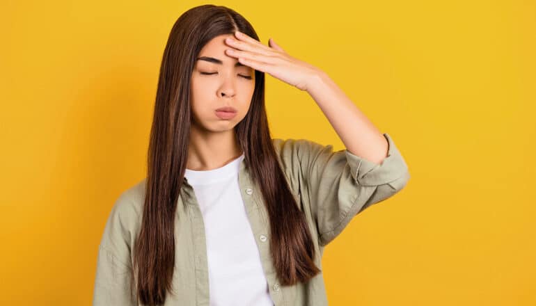 A young woman touches her forehead, closes her eyes, and sighs deeply.